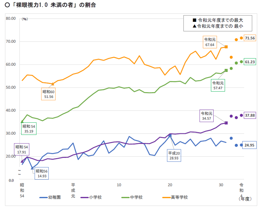 子どもの視力低下は確実に増えています。子どもの裸眼視力1.0未満になる要因は近視以外にもありますが、その8~9割が近視であると指摘されています。